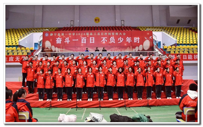春光作序,万物和鸣。为进一步激发高三学子的学习热情,坚定冲刺高考的必胜信念,2024年2月28日下午,静宁县第一中学在学校体育馆隆重集会,举行了一场催人奋进、激昂斗志的盛典——2024届高考百日冲刺誓师大会。学校领导班子部分成员,全体高三教师、学生以及学生家长近2000人参会,共赴这场青春盛宴,见证了这一庄严而神圣的时刻。校党委书记雷升主持。