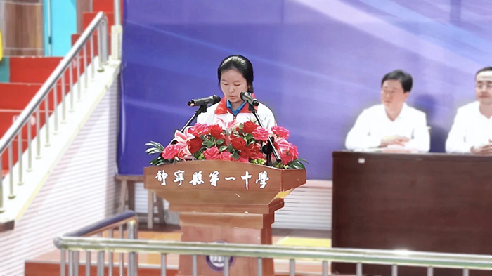 孙晔代表全体同学向辛勤培育学子的全体教师致以崇高敬意与诚挚的教师节祝福,一句“老师,您辛苦了,祝您节日快乐”满含感恩之情。她回顾过去一学年学校成就,提及2025年高考再创辉煌,强调这份亮眼成绩的背后,是老师们的辛勤汗水、无私奉献与学长学姐的不懈奋斗、执着追求,作为一中学子,既为学校荣光自豪,更深感责任在肩。